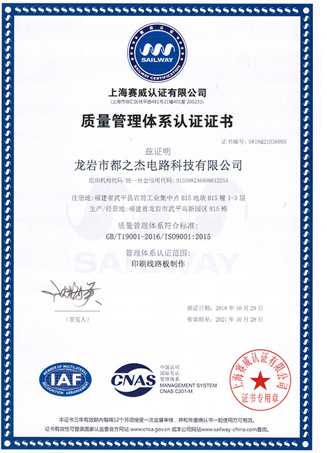 自1997年成立以來,都之杰已經(jīng)獲得ROHS產(chǎn)品認(rèn)證,各項(xiàng)技術(shù)指標(biāo)達(dá)到國家先進(jìn)水平,質(zhì)量和信譽(yù)是企業(yè)的生命,我們一直以來持續(xù)不斷改善產(chǎn)品的質(zhì)量,以質(zhì)量取勝市場(chǎng),提高公司的信譽(yù)度。多年來憑優(yōu)良的產(chǎn)品質(zhì)量、準(zhǔn)時(shí)快捷的供貨和周到細(xì)致的服務(wù),深得國內(nèi)外客戶的好評(píng)。我們已經(jīng)獲得良好的聲譽(yù)和客戶的信任,并逐漸成為客戶可信賴的、能長(zhǎng)期合作的印刷線路板戰(zhàn)略合作供應(yīng)商。我們堅(jiān)持向國內(nèi)外先進(jìn)企業(yè)學(xué)習(xí)并不斷提升自主創(chuàng)新。公司擁有經(jīng)驗(yàn)豐富及穩(wěn)定的團(tuán)隊(duì),視質(zhì)量為企業(yè)生命,嚴(yán)格推行ISO9001質(zhì)量管理體系,符合ROHS標(biāo)準(zhǔn),并獲得了UL安全認(rèn)證、TS16949和CQC認(rèn)證。
